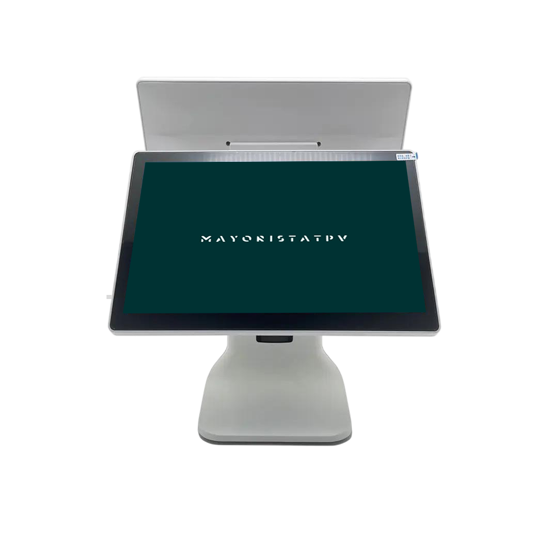 Este TPV incorpora una pantalla táctil principal CTP de 15,6 pulgadas para el operario y una pantalla secundaria de 11,6 pulgadas orientada al cliente, totalmente personalizable en tamaño y compatible con entorno Windows, perfecta para mostrar importes, pedidos, promociones o información comercial.