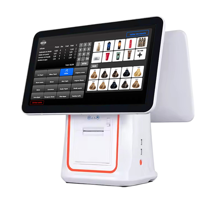 Incorpora una pantalla táctil principal de 15,6 pulgadas con resolución 1366 x 768, que ofrece una visualización clara y un manejo cómodo para el operario, junto con una pantalla trasera orientada al cliente, perfecta para mostrar el importe, el pedido o información visual durante el proceso de cobro.